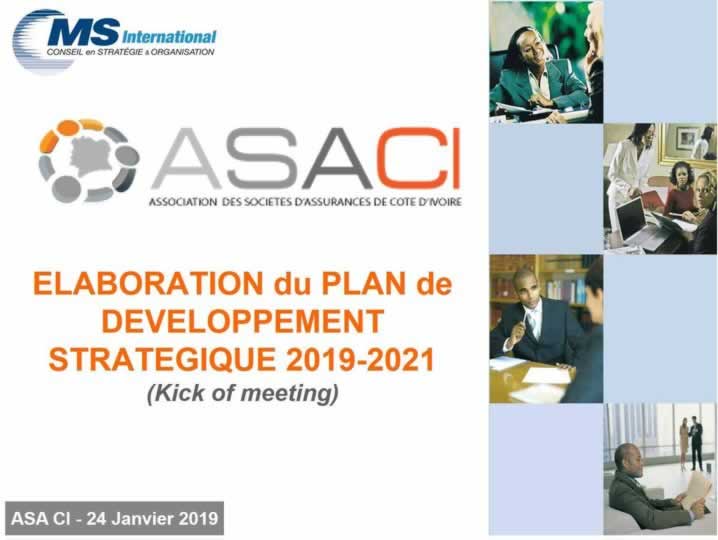 Mandaté par l'ASA CI (Association des Sociétés d'Assurance de Côte d'Ivoire) pour l'élaboration de son Plan de Développement stratégique 2019-2021, le Cabinet de conseil en stratégie et organisation MS International a procédé ce jeudi 24 Janvier 2019 au lancement de la mission.